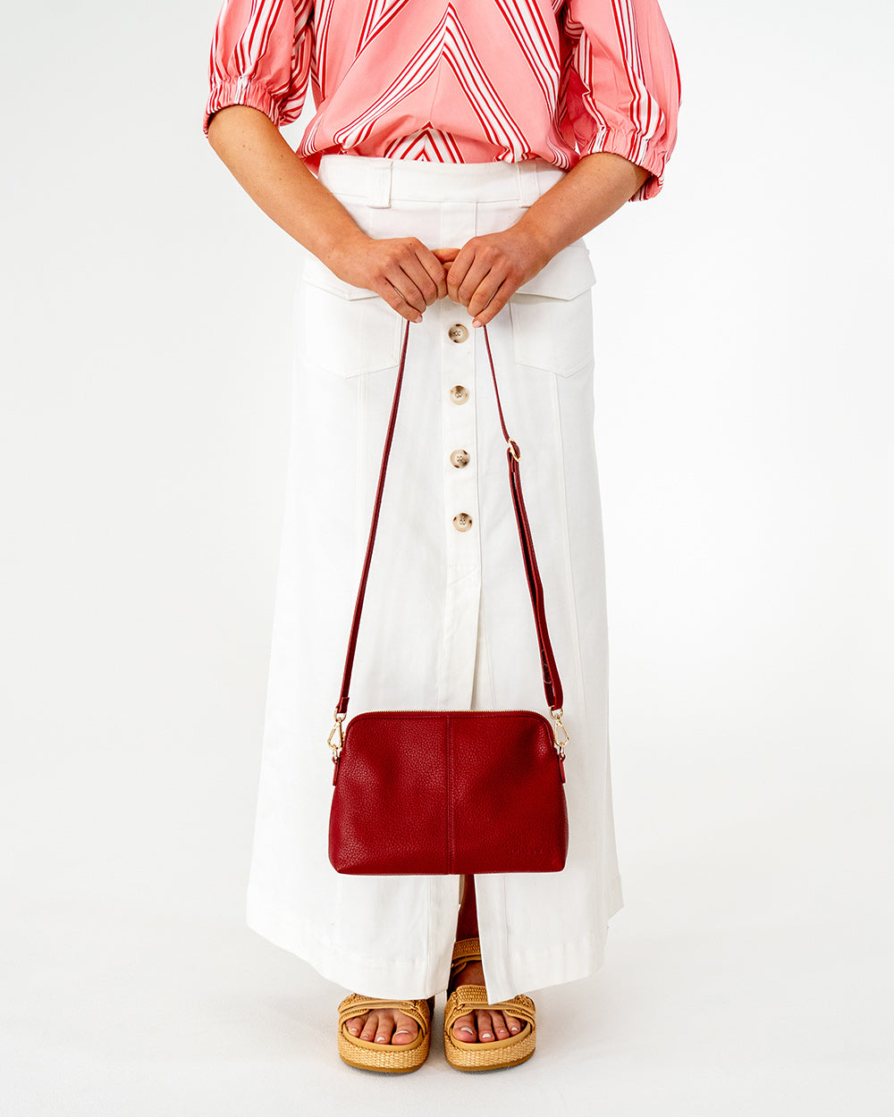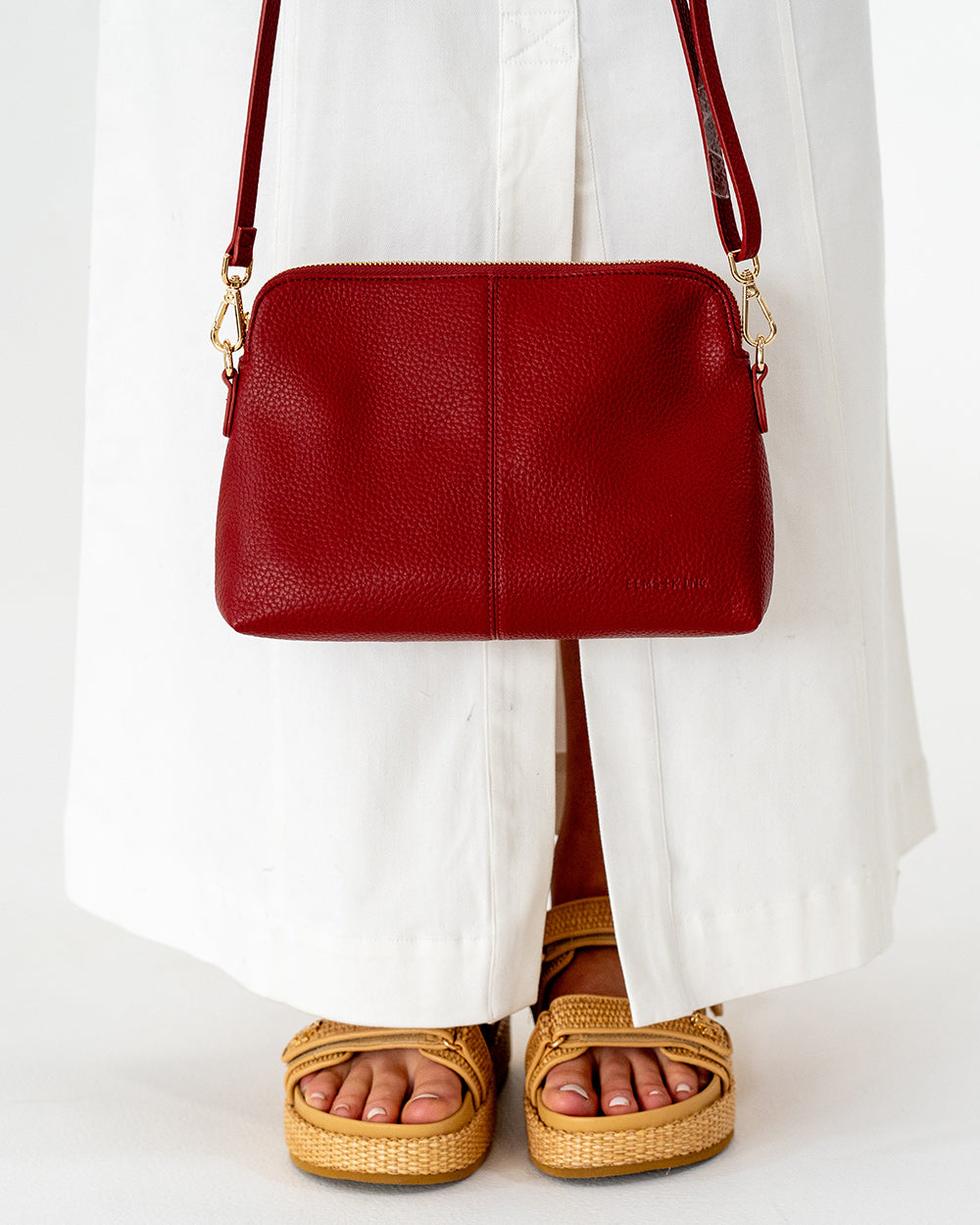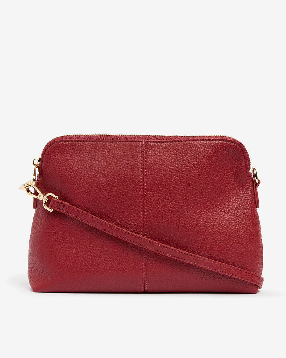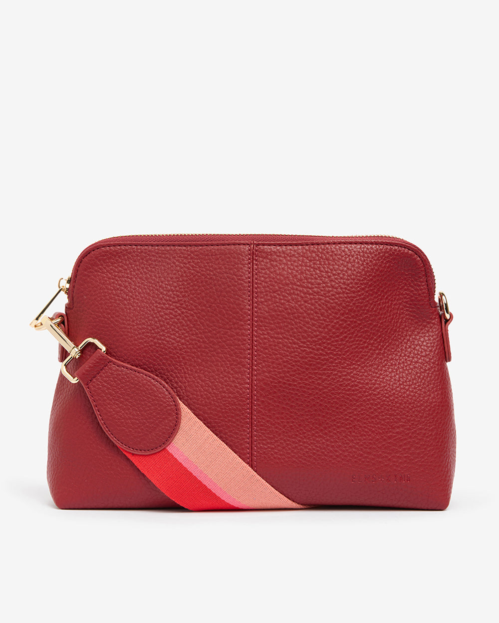 The Elms+King Burbank Crossbody Large offers the functionality and hands-free ease of the compact best-selling Burbank, just with added capacity. Made from premium 100% recycled polyurethane with 14-karat light gold-plated hardware, the Burbank Crossbody Large offers a secure top zipper, our signature blue & white gingham lining and ample depth for all your essentials. The bag comes with two strap options, one wide cotton webbing strap in our exclusive custom stripe, adjustable to 140cm and a second narrow PU strap, also adjustable to 140cm.