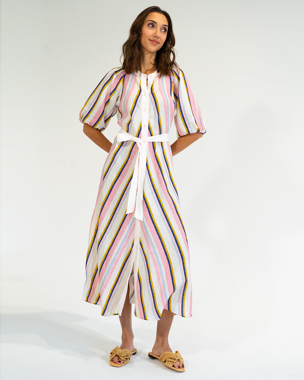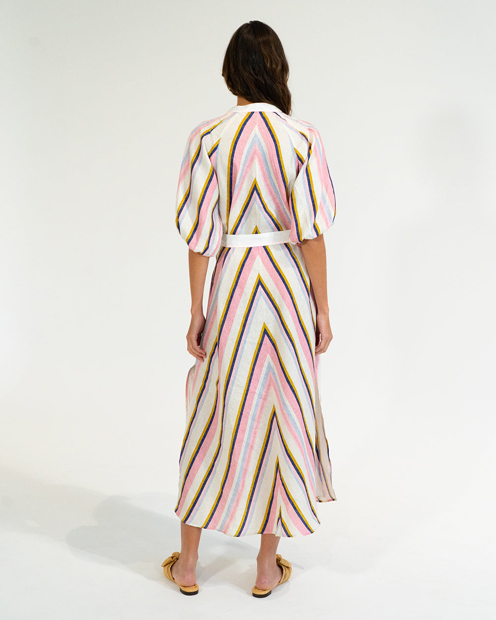The Cannon Dress is a timeless silhouette with a modern edge. Its bias-cut construction drapes effortlessly, while a contrast stand-up collar and button-through placket add contemporary tailoring details. Raglan sleeves with stitched tucks and elastic cuffs create soft volume, making it perfect for casual days or elevated evenings.
