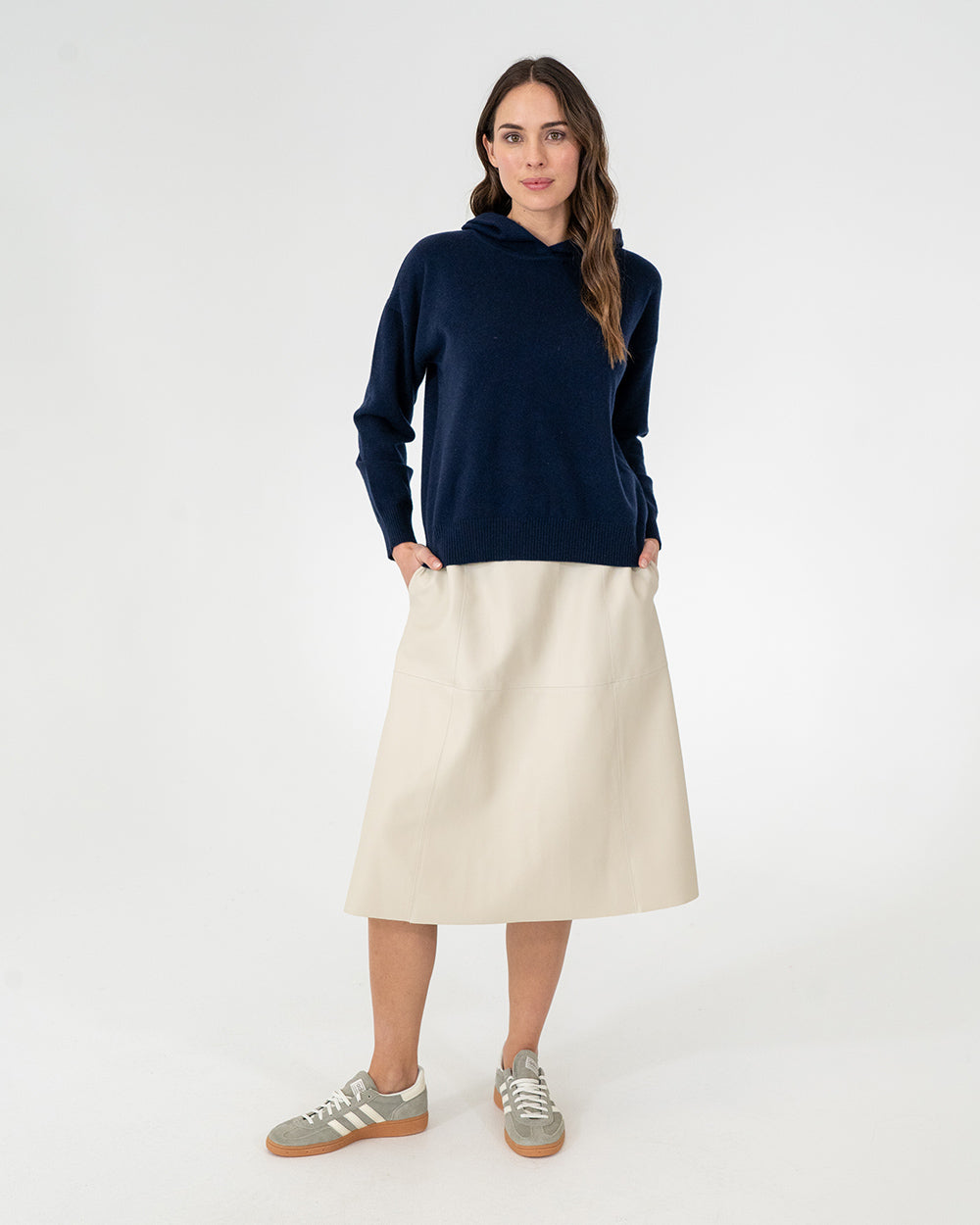 Modern and versatile, the Cooper Row Skirt is crafted from 100% PU faux leather with a soft viscose backing, offering a luxe look with a comfortable feel. Designed in a flattering A-line silhouette, it features a gathered waist that can be worn high on the waist or lower on the hips for a relaxed vibe. Functional side pockets add practicality, while the raw hem lends a contemporary edge. Style it with a tucked-in knit for a polished look or a casual tee for effortless chic. A timeless piece with endless styling potential.