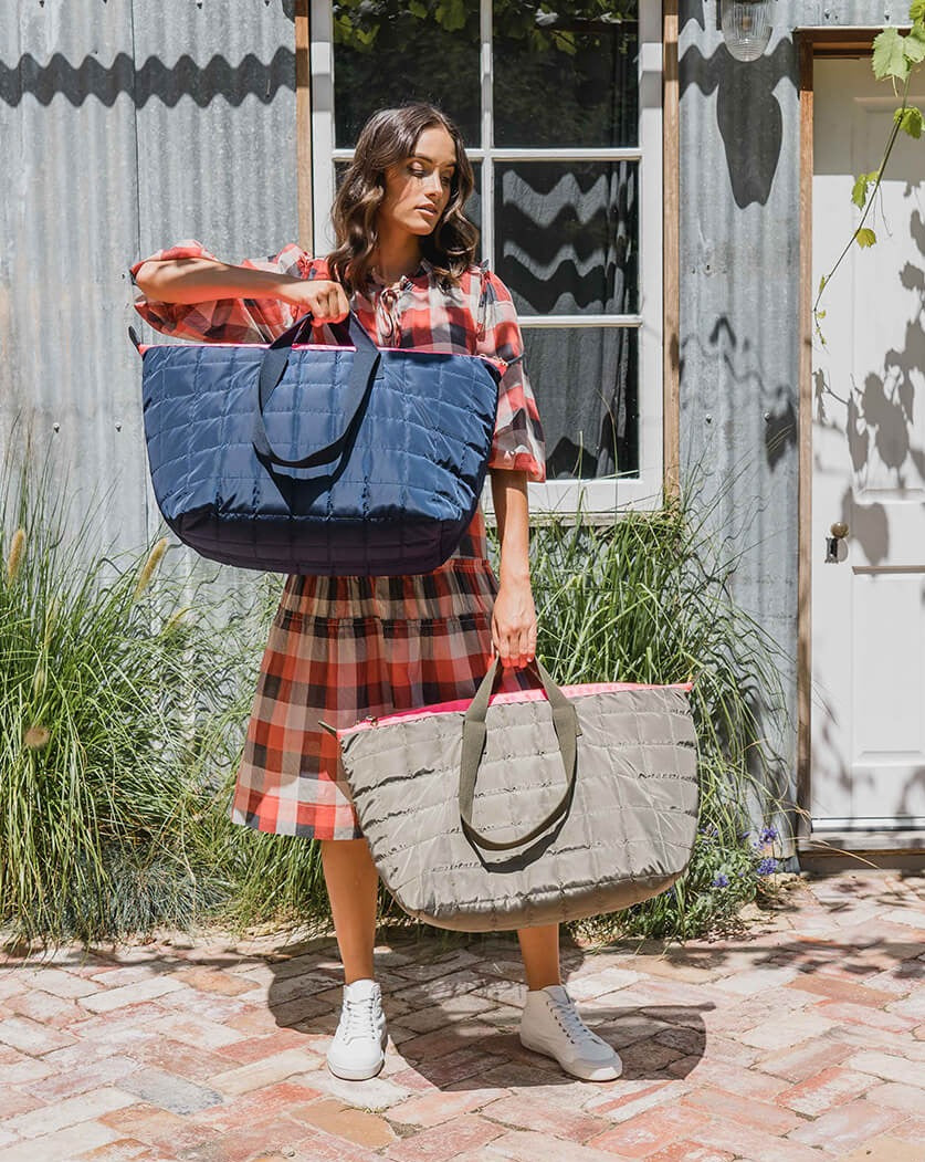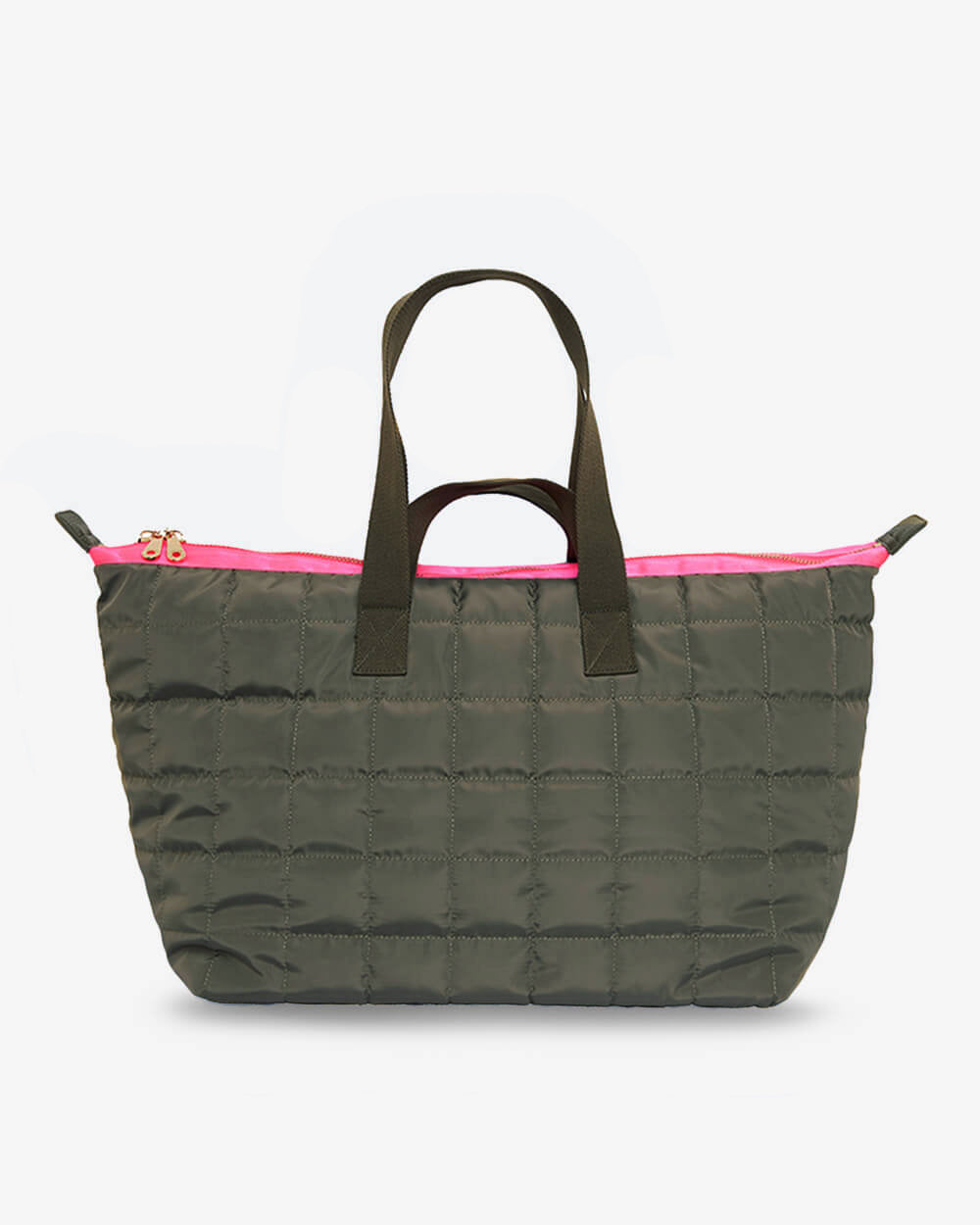 The Elms+King Spencer Carry All is the stylish weekend accessory we have all been dreaming of. With its two top-grip handles of varying drop height and an internal zip-pocket for ease of access, this Carry All can be used as a weekender, beach bag or everyday accessory for those of us always on the move. Made from premium quilted nylon with 14-karat light gold-plated hardware, the Spencer Carry All features a bright pop nylon lining.