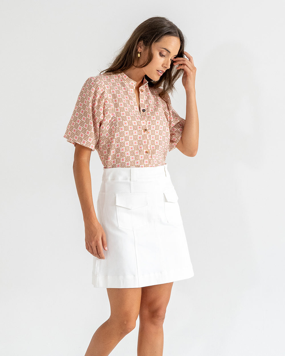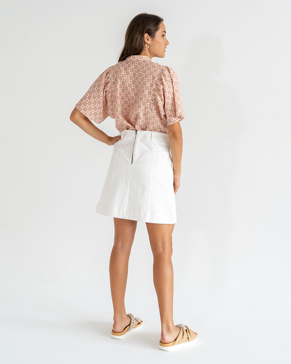 The Lincoln Mini Skirt is a must-have addition to your wardrobe for both style and practicality. The A-line silhouette flatters any figure, while utility-style pockets add a touch of functionality and charm. Featuring an exposed back zipper, this skirt combines convenience with sophistication. Designed to sit on the waist, it offers a classic look that can easily transition from day to night. For a slightly lower fit, simply size up.