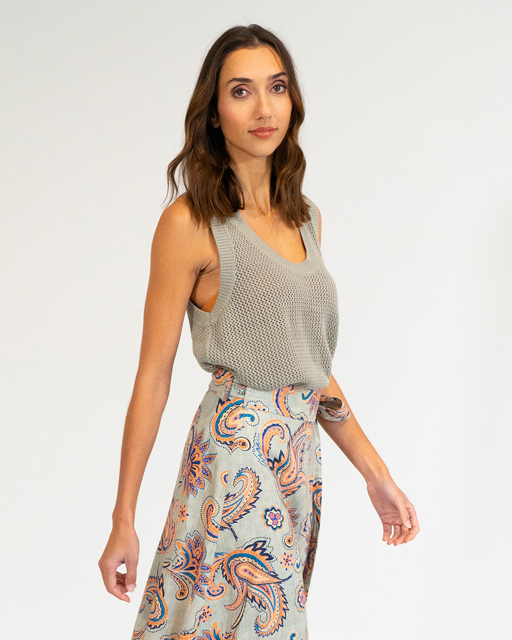 The Palm Cove Knit is a lightweight, versatile layering piece for transitional dressing. Its open-weave cotton construction offers breathability and a relaxed yet polished feel, while a scoop neckline with rib detailing adds subtle structure. Perfect layered over a camisole or under a blazer, it effortlessly moves from casual to elevated styling.