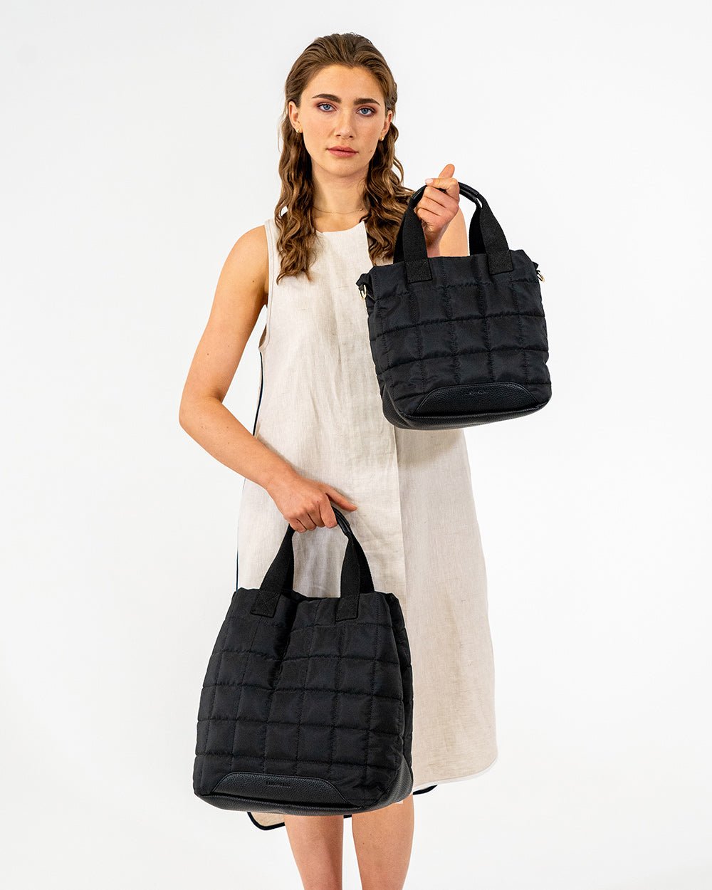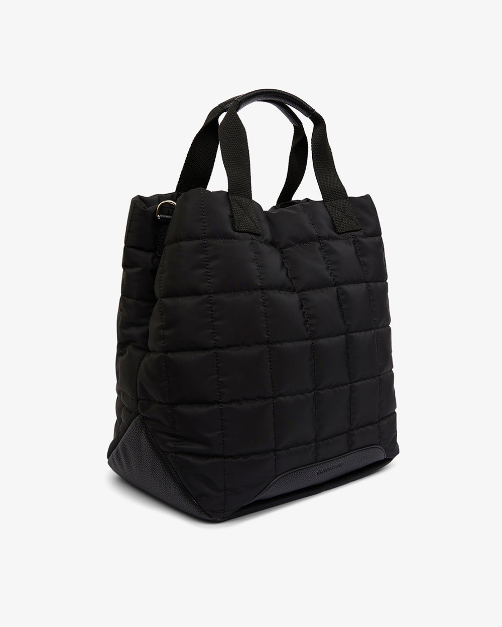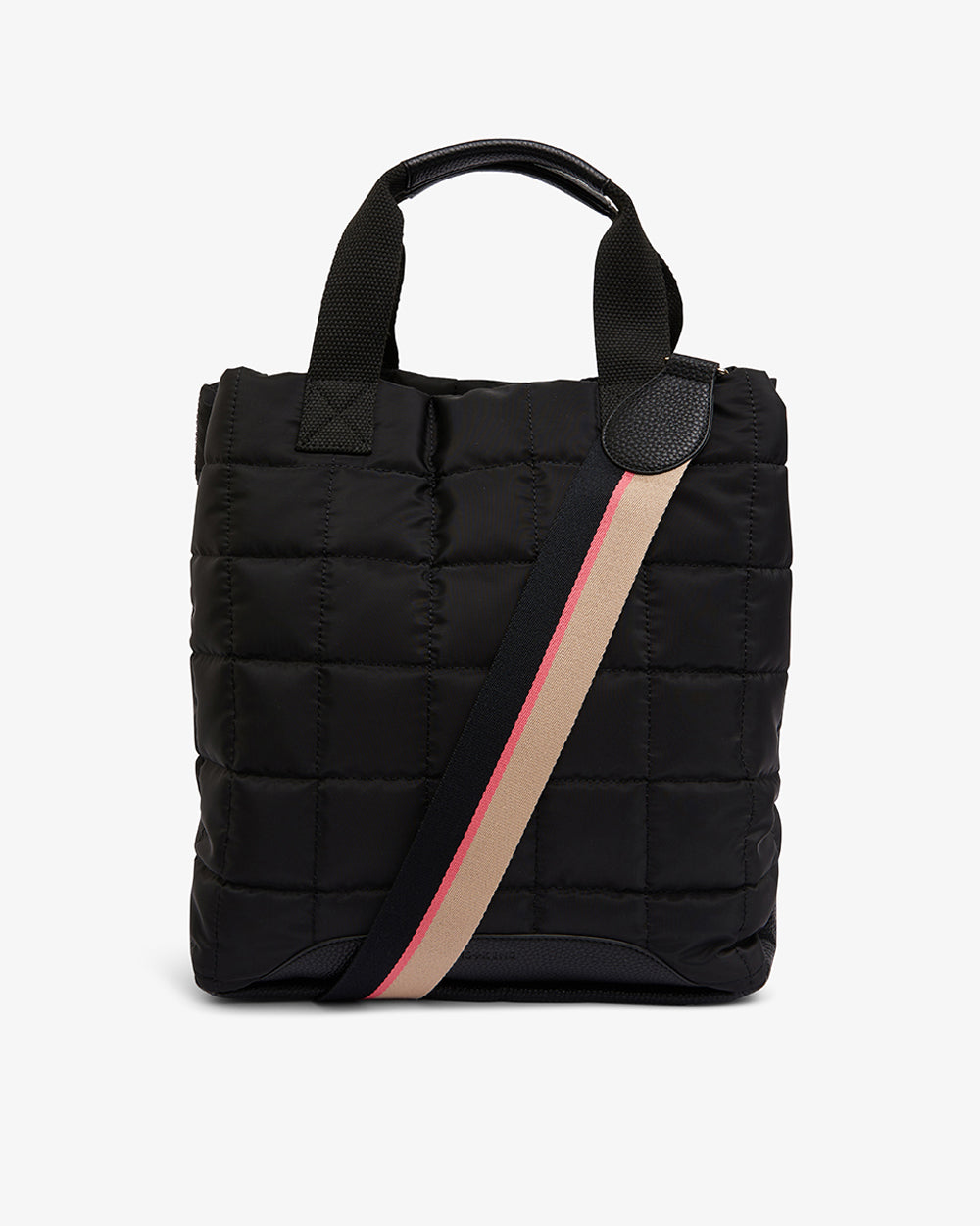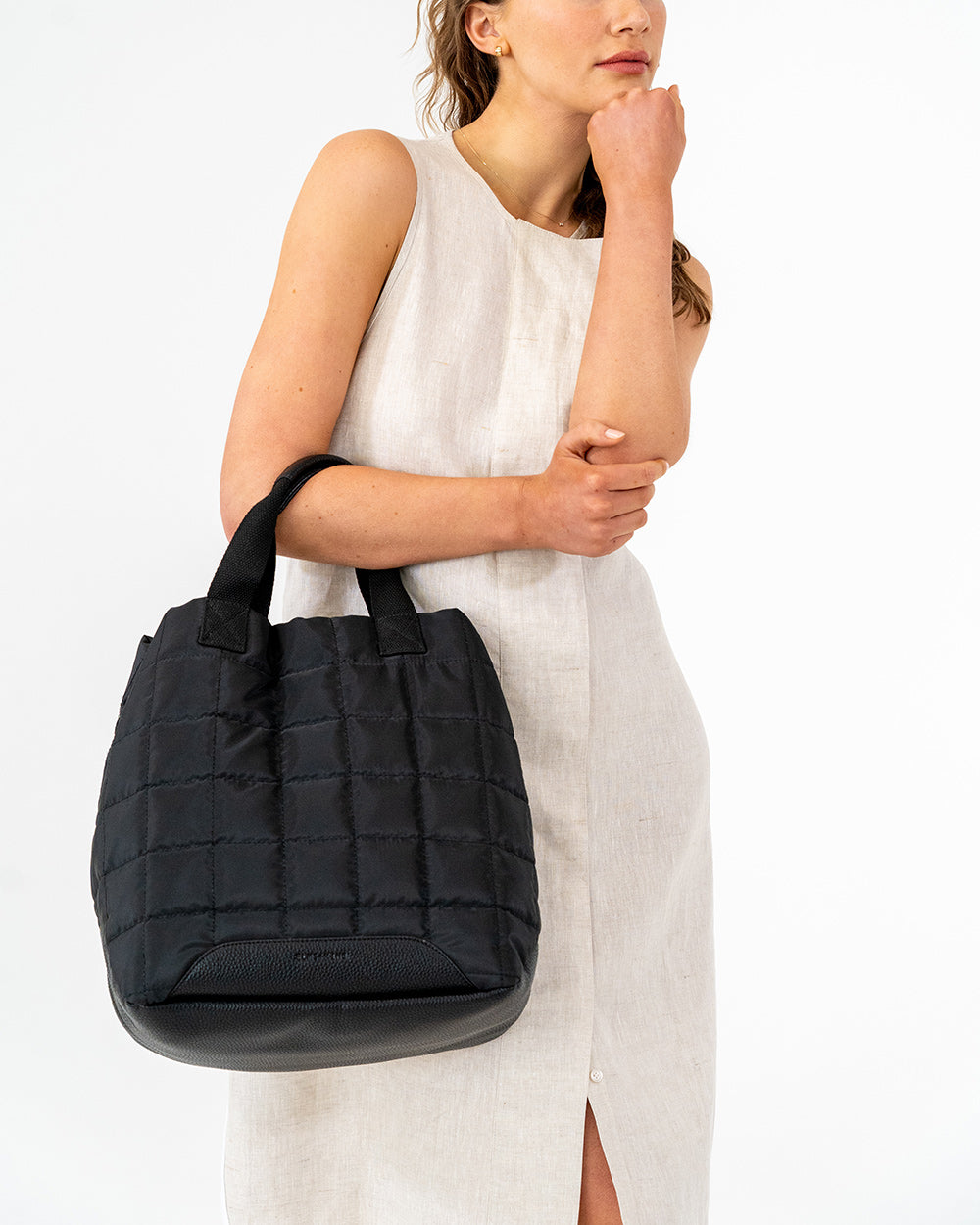 The Elms and King Santa Monica Tote is bucket-style tote. The tote features a centre buckle closure, and interior detailing to hold all your essentials. With handy top grip handle, plus a removable crossbody strap, whether your day starts at the gym, or out & about, the Santa Monica has you covered. Made from premium quilted nylon, the Santa Monica Tote features a contrast oyster nylon lining.