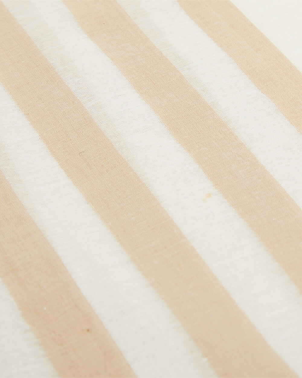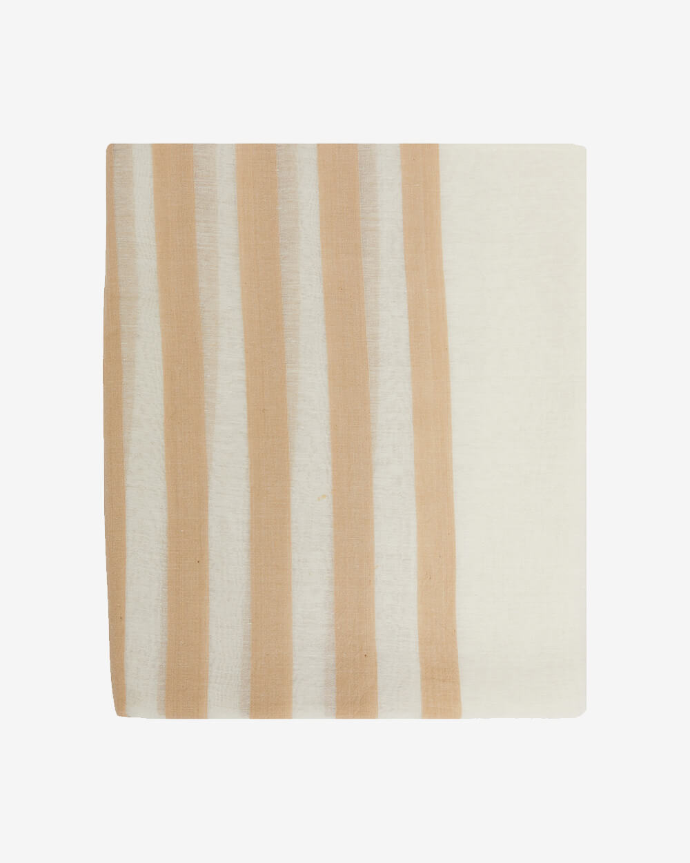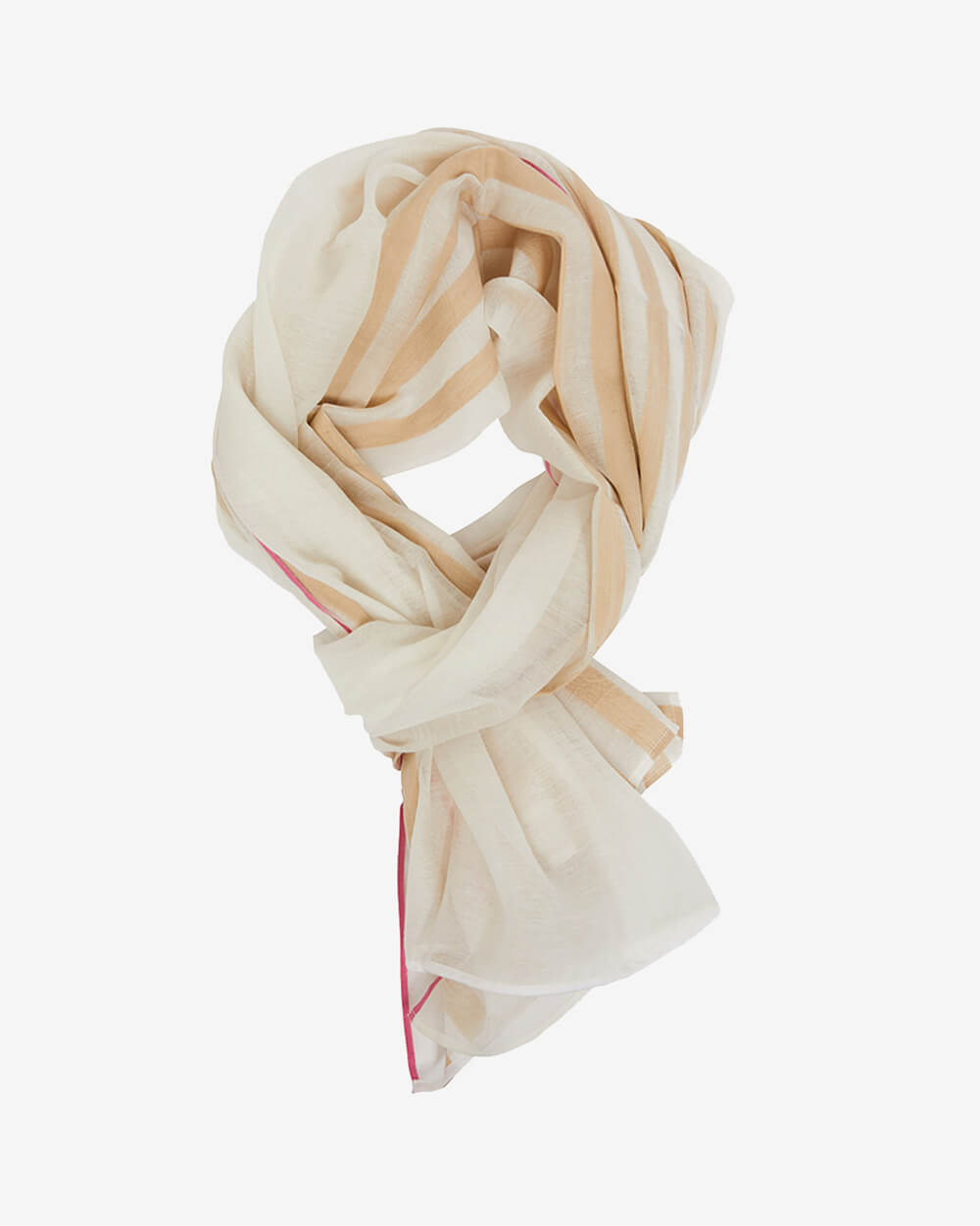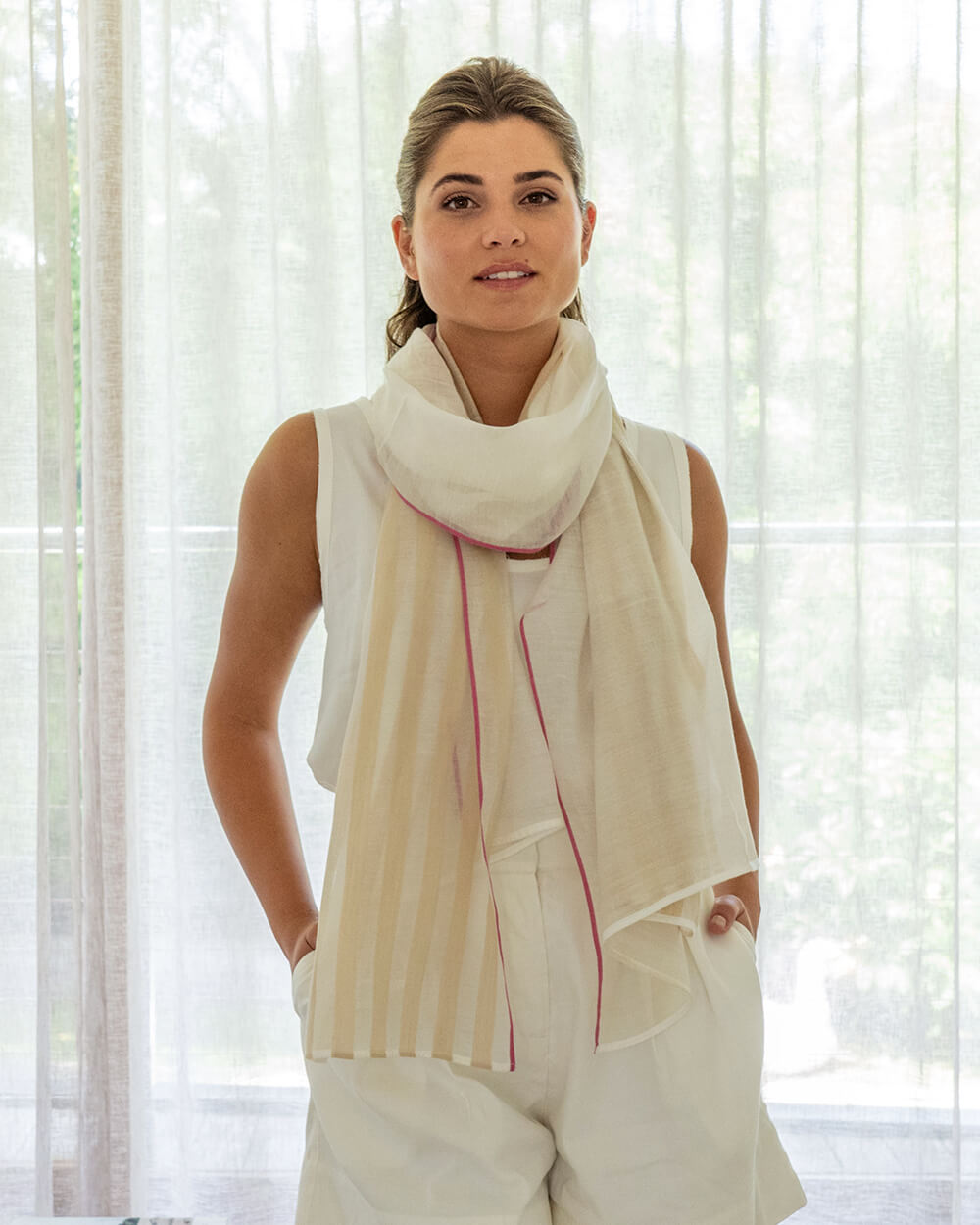 The Elms+King Silk Cotton scarves are crafted from a hand loomed silk cotton blend (30% silk, 70% cotton). The fabric has a beautiful soft, dry hand feel. We produce our designs working directly with a small supplier in India, and all scarves are hand loomed to order. Blush stripe with fluoro peach stripe.