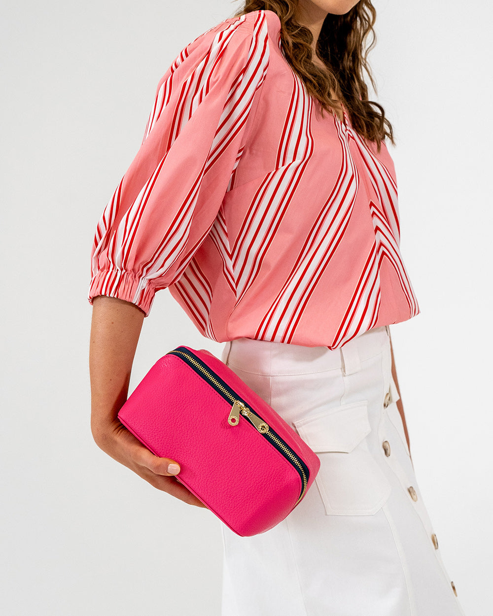 The Elms+King Washbag opens to reveal a spacious interior and two elasticated pockets. Lined with our signature brand lining, you will never lose track of your favourite items. Made from premium GRS polyurethane (PU) with 14-karat light gold-plated hardware the washbag will keep all your beauty essentials in good order.