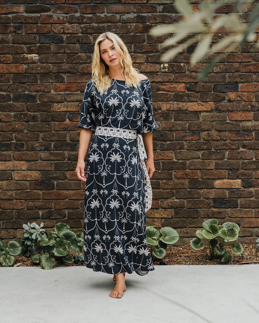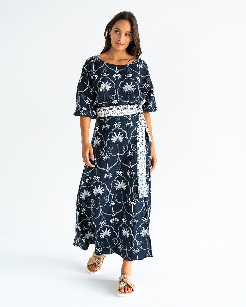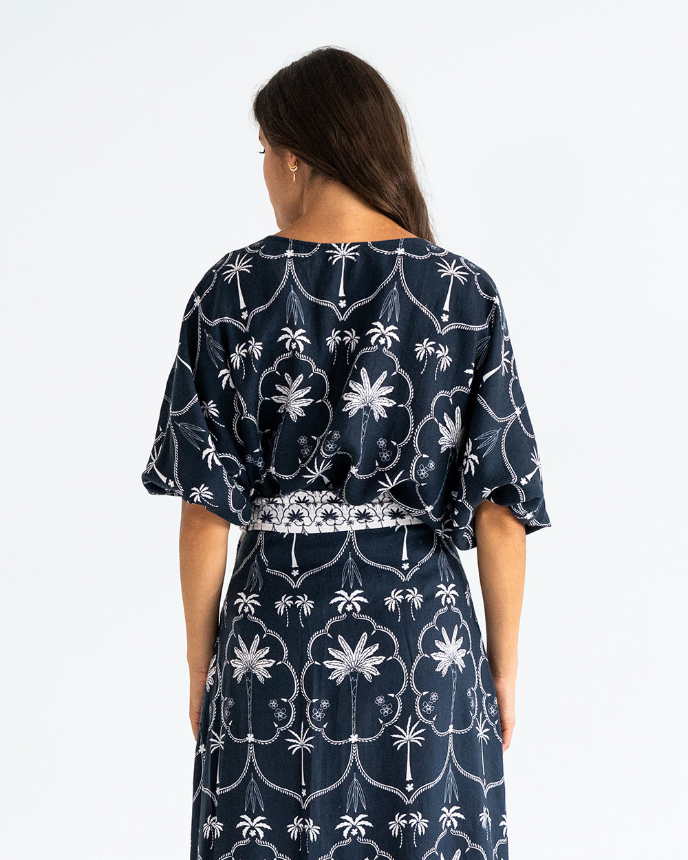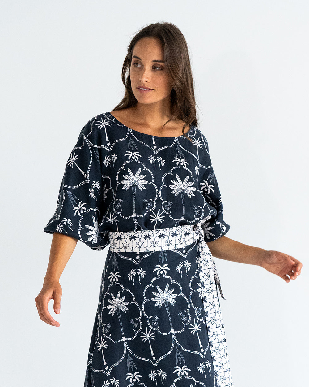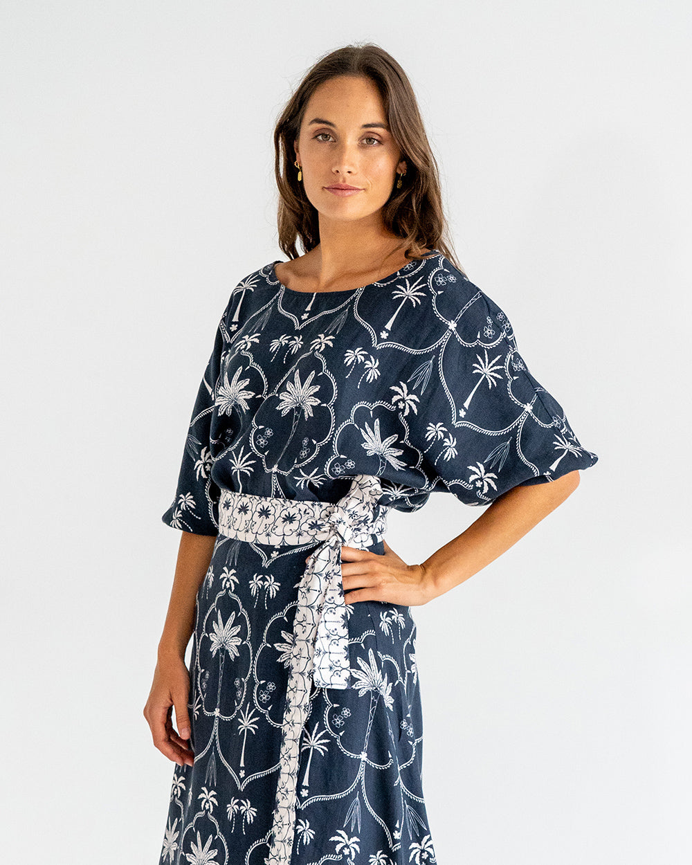 The Whitehaven Blouse is a batwing style blouse with a wide scoop neck and an elasticated cuff. Crafted from a gorgeous linen with our exclusive navy palm print.
