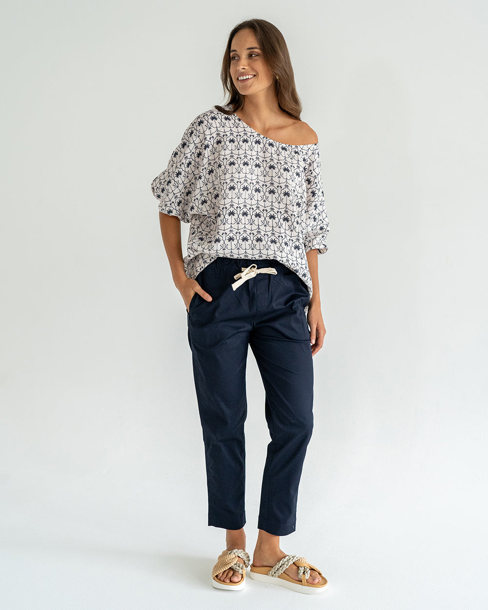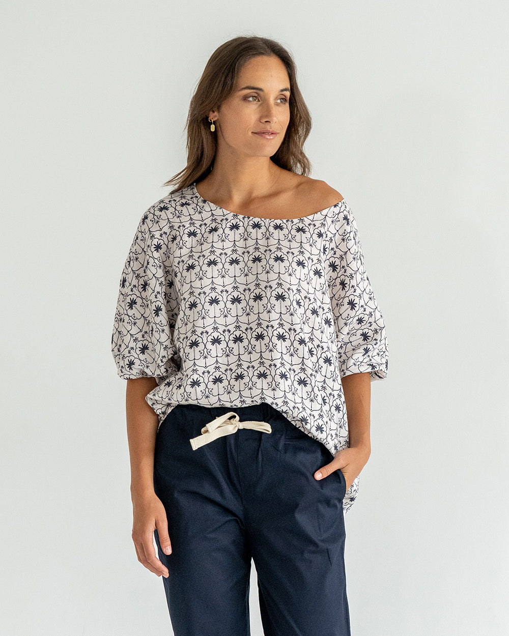 The Whitehaven Blouse is a batwing style blouse with a wide scoop neck and an elasticated cuff. Crafted in our exclusive small hibiscus print, made from 100% linen.